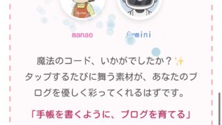 ブログを訪れた読者が画面をタップするたびに、キラキラや紙吹雪がふわっと舞い上がる…。そんな遊び心あふれる「魔法のコード」を紹介します。WordPressのカスタムHTMLに貼り付けるだけで、あなたのブログが手帳をデコるように楽しく変身!manaoとGeminiと一緒に、素敵な手帳ライフを楽しみましょう。