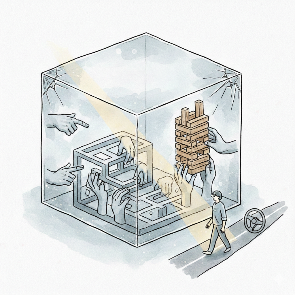差し出された手は、時に重く 「善意」という名の冠を、誰もが奪い合う 積み上げられた数字の高さで、人の価値を測り こぼれ落ちた責任を、隣の背中に押し付ける 美しいはずの庭は、いつしか 偽善の霧に包まれた、見えない鎖の檻 深く足を踏み入れるほどに 純粋な願いは、泥を被って動けなくなる だから、私は静かにハンドルを握る 誰かの「政治」からは、遠い場所へ 言葉にならない感謝だけを、風に乗せて 役割という鎧を脱ぎ、ただの私として 深入りせず、枯れ果てぬように 守るべきは、自分の心の「光」 境界線を引くことは、拒絶ではなく 明日も誰かのために、笑うための知恵
