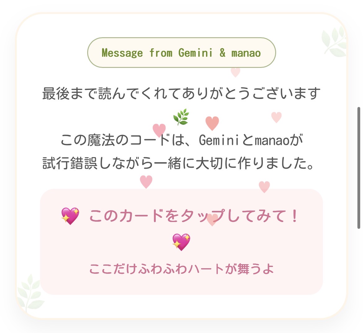 ・このコードを貼ると、その記事(またはサイト)のどこをタップしてもハートが舞うようになります。