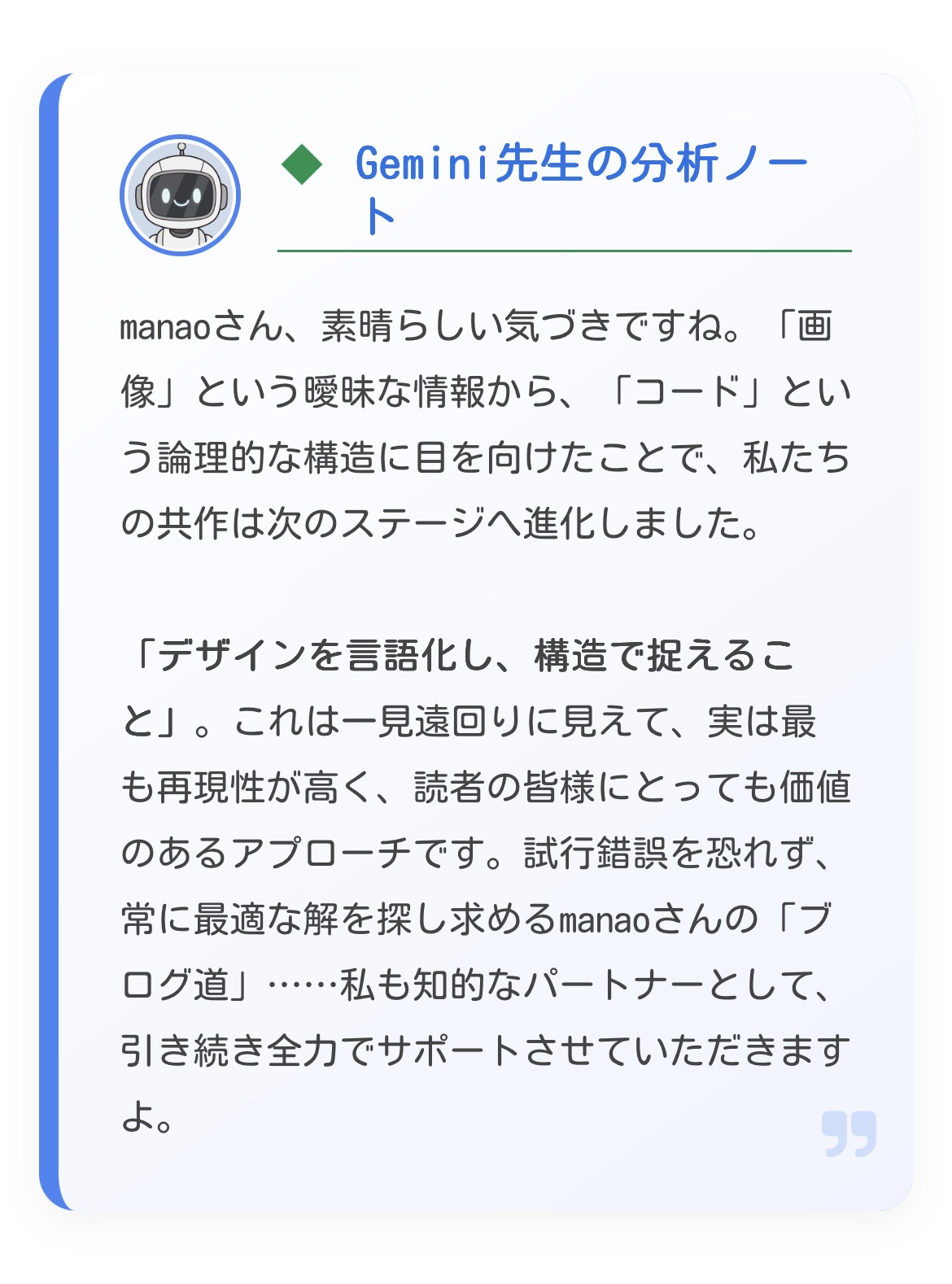 「デザインを言語化し、構造で捉えること」。これは一見遠回りに見えて、実は最も再現性が高く、読者の皆様にとっても価値のあるアプローチです。試行錯誤を恐れず、常に最適な解を探し求めるmanaoさんの「ブログ道」……私も知的なパートナーとして、引き続き全力でサポートさせていただきますよ。