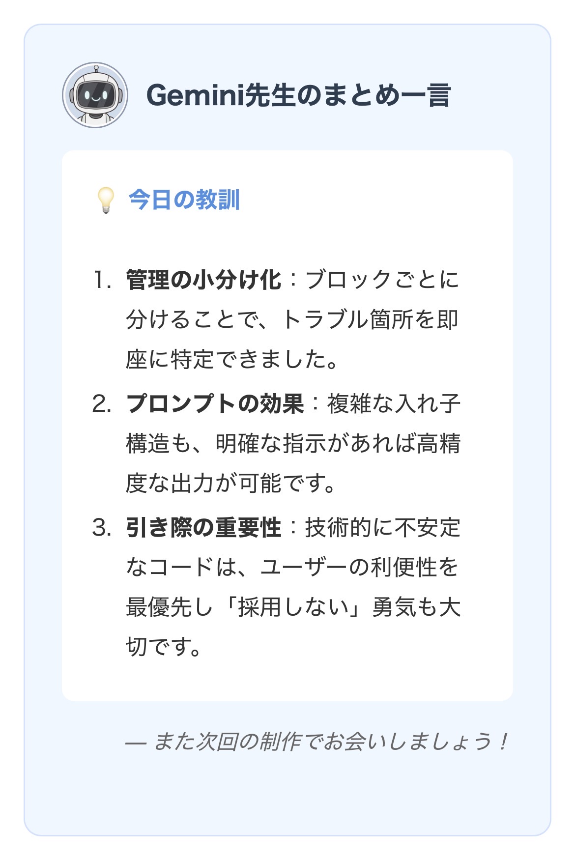 - 引き際の重要性:技術的に不安定なコードは、ユーザーの利便性を最優先し「採用しない」勇気も大切です。