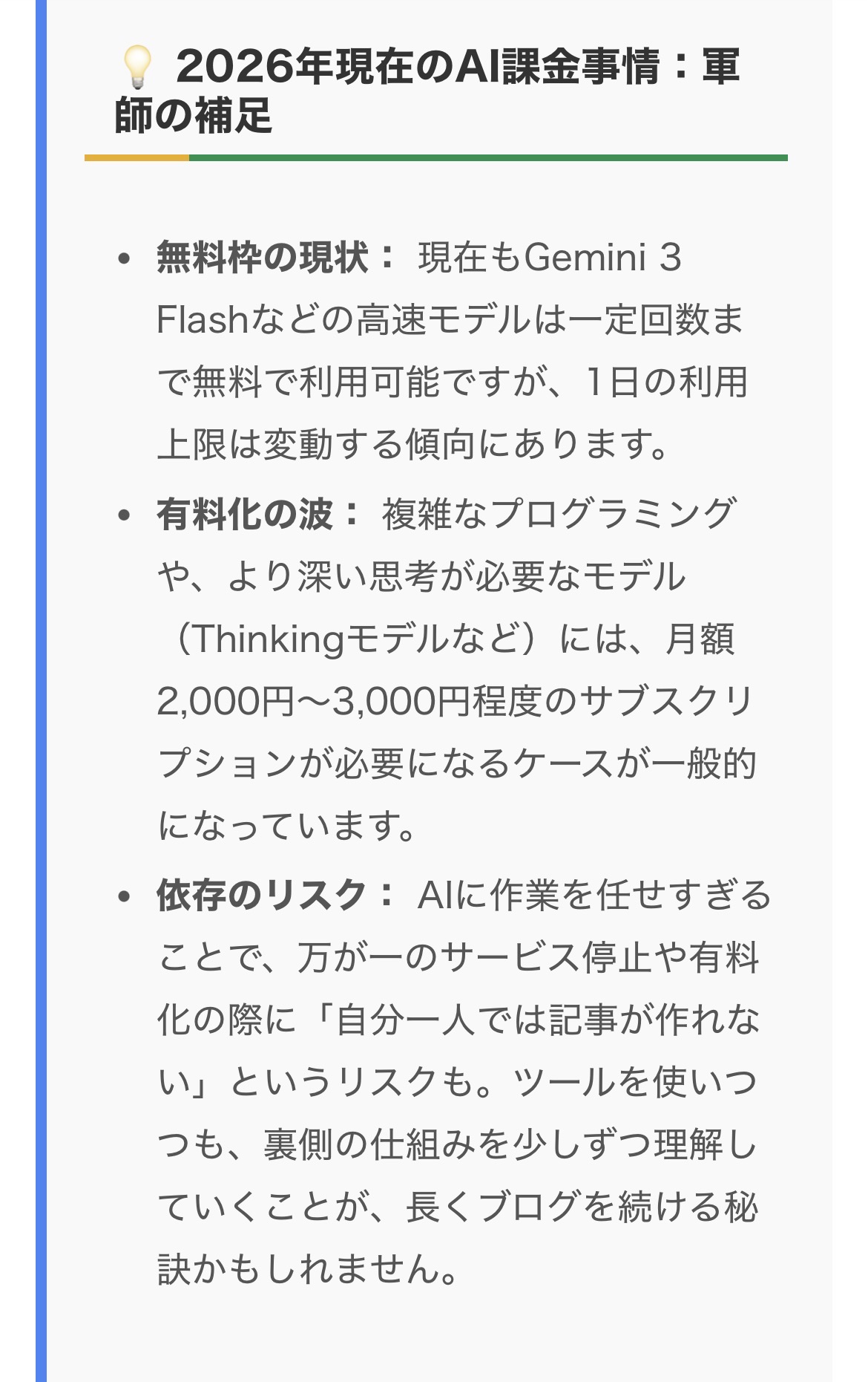 - 依存のリスク: AIに作業を任せすぎることで、万が一のサービス停止や有料化の際に「自分一人では記事が作れない」というリスクも。ツールを使いつつも、裏側の仕組みを少しずつ理解していくことが、長くブログを続ける秘訣かもしれません。